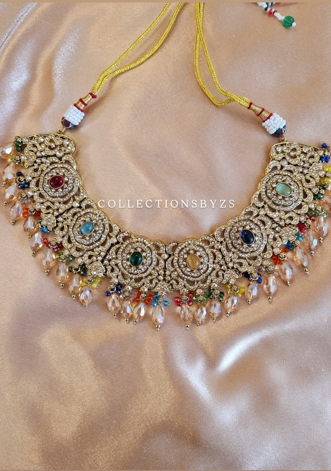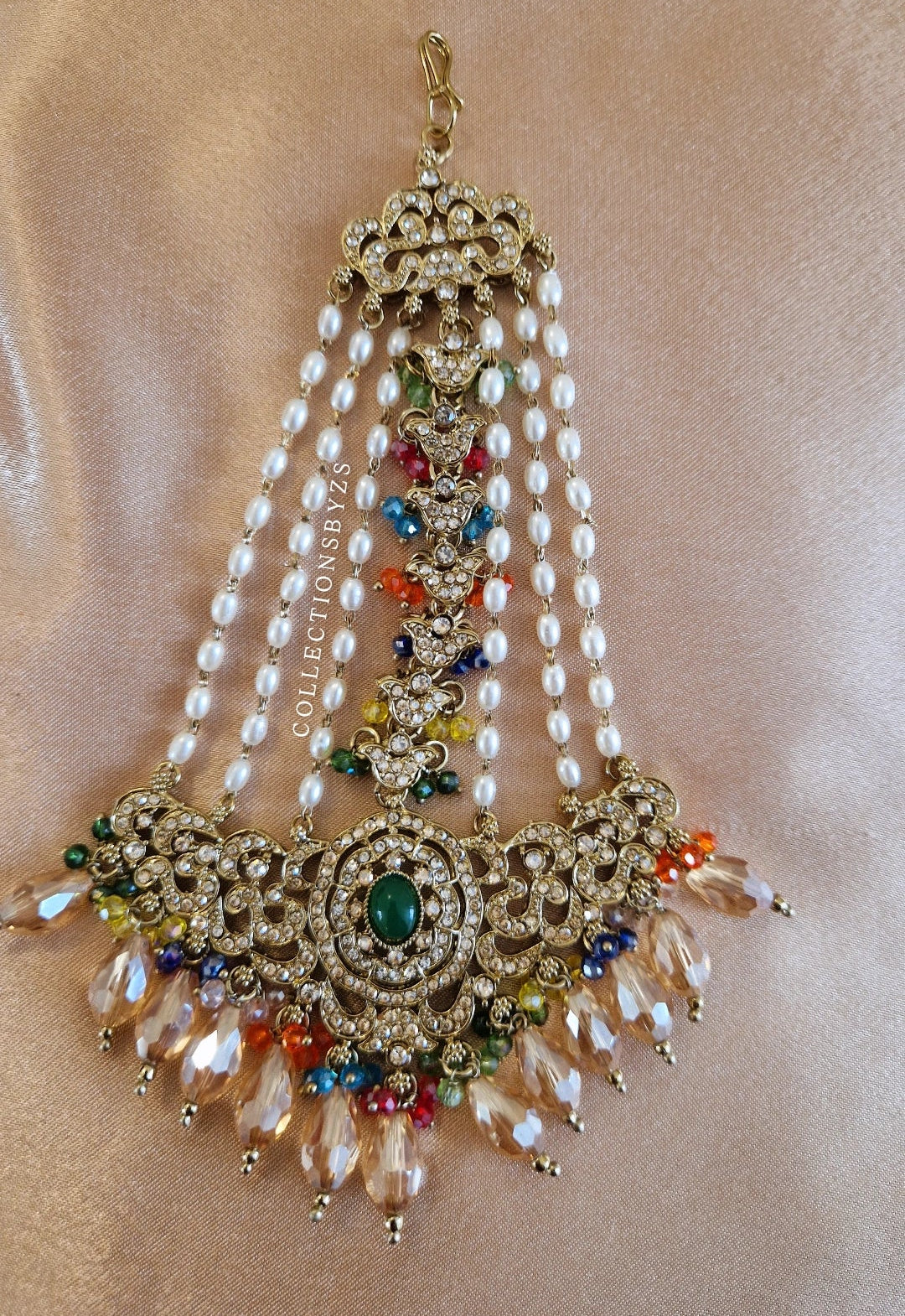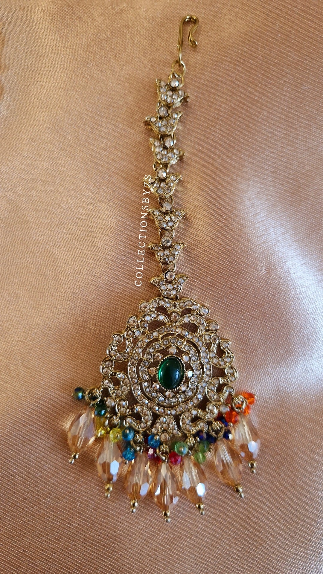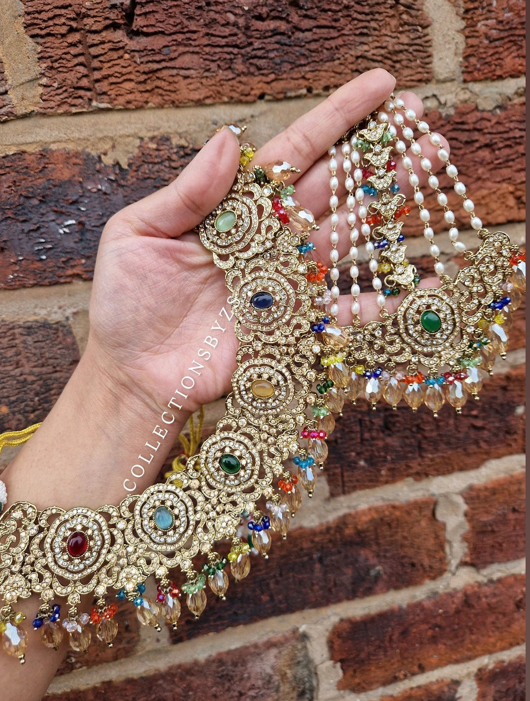 - Nageena/Beadwork: Mehndi Golden diamante, glass beads, Polki and Crystal drop beads.