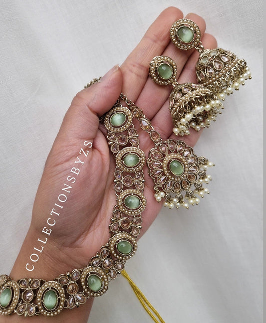 S A L M A - Small Elegant Indian Necklace Set - LIGHT GREEN